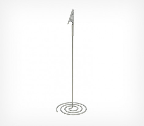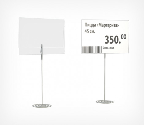 Хромированный держатель ценника устанавливается на любые горизонтальные поверхности. Имеет основание в виде спирали. Зажим прищепка позволяет закрепить вставку толщиной до 5 мм и весом до 5 г.
