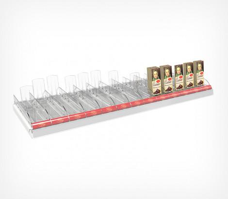 Набор из 13 лотков для выкладки плиточного шоколада. Поставляется в собранном виде, благодаря этому установка на полку занимает за считанные секунды. В набор включены цветные вставки во фронт для организации сегментации на полке по типам шоколада. Для полки размером 1250мм.