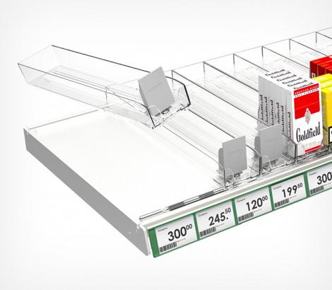 Сигаретные лотки очень просты в применении - нет необходимости выставлять нужную ширину между стенками и крепить толкатель.  Достаточно просто защёлкнуть лоток на крепёжных профилях, и им можно пользоваться! Подойдёт для любой продукции, сходной по габаритам с пачкой сигарет.