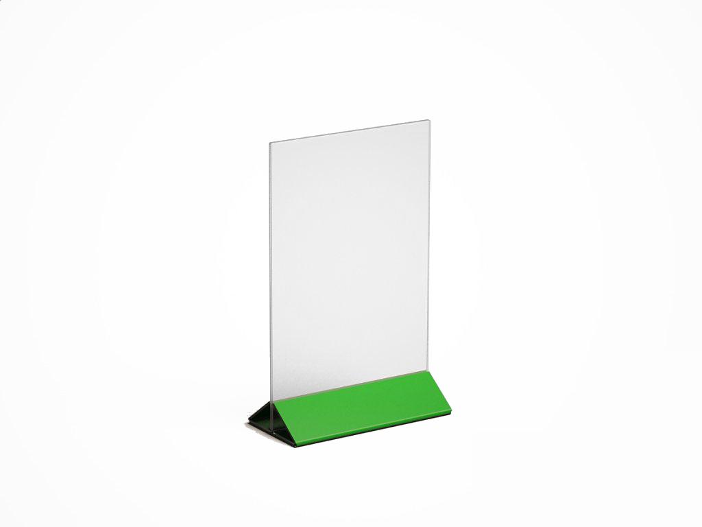 МЕНЮХОЛДЕР ФОРМАТА А-5, С НИЖНЕЙ ЧАСТЬЮ РАЗЛИЧНЫХ ЦВЕТОВ, КЛАСИЧЕСКОГО ВИДА. СОСТОИТ ИЗ ДВУХ ЧАСТЕЙ, ПРОЗРАЧНОГО ПЛАНШЕТА ИЗ ОРГСТЕКЛА И НИЖНЕГО ДЕРЖАТЕЛЯ, ТРЕУГОЛЬНОЙ ФОРМЫ ИЗ ЦВЕТНОГО ПОЛИСТИРОЛА.