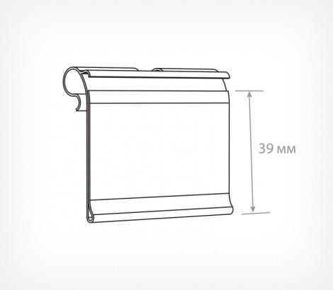 Подвешивается на T-образные одинарные или двойные металлические крючки. При снимании товара с крючка откидывается вверх, затем возвращается в исходное положение. Высота ценникодержателя 39 мм.