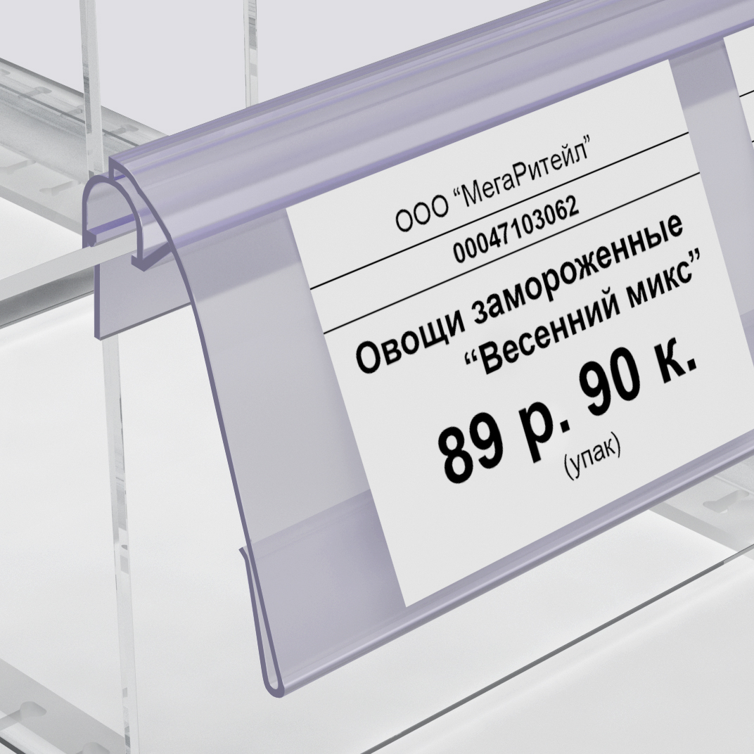 Ценникодержатель предназначен для размещения ценников на сетчатых полках, корзинах распродаж, дисплеях из металлической проволоки. Конструкция профиля позволяет закреплять его на металлических прутьях и при необходимости легко откидывается вверх для удобного вынимания товара с полки.
