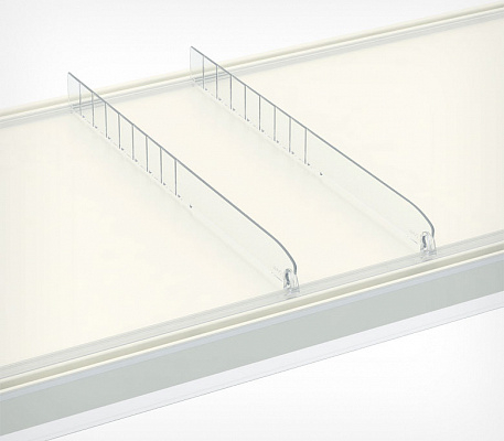 Разделитель DIV30-B выс.30 мм без огран.185-385 мм - предназначен для организации выкладки небольших лёгких товаров, таких как сигареты, лекарства, парфюмерия и косметика. материал: прозрачный ударопрочный пластик, имеет насечки с шагом 25 мм для обламывания по длине. Особенности: подходит для полок глубиной 200–400 мм. Задняя часть разделителя разделена на фрагменты, которые можно отрезать, чтобы регулировать длину. Для крепления на полку нужны специальные профили, которые фиксируются на переднюю и заднюю стороны полки. На передней и задней части разделителя есть вырезы (замки) для фиксации на профиль.