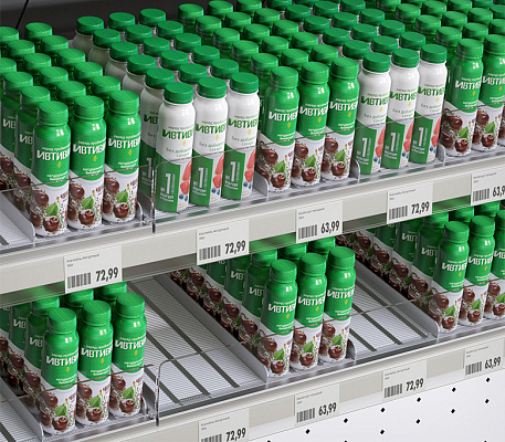 Необходим для разделения товаров на полке. Высота разделителя должна быть не менее 1/3 от высоты продукта. Если полка является крайней, то для предотвращения падения продуктов используется высокий разделитель с этого края.
