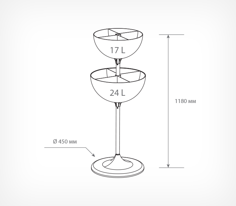 UNIBOWL-TOWER-DIV — двухуровневый дисплей для выкладки продовольственных и непродовольственных товаров в компактной упаковке. Состоит из двух чаш разных объёмов, что позволяет увеличивать объёмы выкладки и эффективность использования торговой площади.